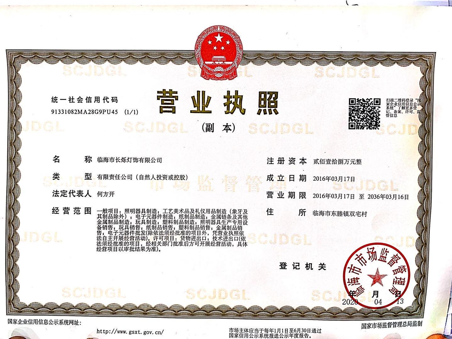 Linhai Changshuo Lighting Co., Ltd. was established on March 17, 2016. It is located in Shuangzhai Village, Linhai Dongcheng, Taizhou with beautiful scenery and convenient transportation. It is a high-tech enterprise integrating research, development, production, sales, and service of lighting lamps, handicrafts, toys, electronic components, plastic products, and metal products. The company has a standard factory of 8000 square meters, and currently has a total production capacity of 73 people. It has 8 punching machines, 1 laser cutting machine, 15 laser welding machines, 11 spot welding machines, 6 bordering machines, 3 injection molding machines, 3 drilling machines, 2 hot lamps, 4 assembly lines, the main products are Christmas lights, including iron art lights, tree lights, copper wire lights, LED lights, etc., have obtained CE and other international standards certification, and the annual output has reached 7 million sets. After continuous market development and refined management innovation, we always provide customers with high-quality products and technical support, and sound after-sales service. The company has a young and creative management team. Under the premise of grasping the existing market, keeping up with the current trends, the company is committed to the development of new products to meet the market needs of different customers. Through years of unremitting efforts, our company has passed IS090001, CVS, WMFCCA, SCAN TGTFA certification. The company’s products are mainly sold to the European, American, British and Japanese markets. The company’s mission is to "lead the industry and provide opportunities for every customer to achieve a wonderful life goal", and to "pursue perfect quality and win customer satisfaction." as the quality policy, and is committed to achieving the vision goal of "establishing Changshuo as a leader in the lighting industry, a domestic first-class enterprise, and a world-renowned brand!"