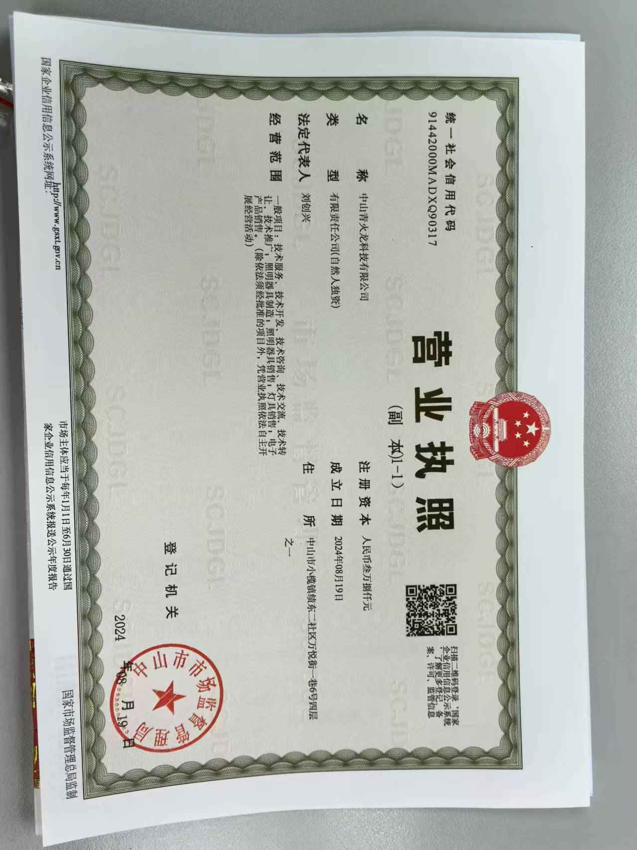Zhongshan Qinghuolong Technology Co., Ltd. was established on August 19, 2024, the legal representative of Liu Chuangxing, the registered address of the enterprise is located in Zhongshan City, Xiaolan Town, Jiedong two community Wan Yue Street, Lane 1, No. 6, one of the four floors of the industry for software and information technology services, the scope of business includes: general items: technical services, technology development, technology consulting, technology exchanges, Technology development, technology transfer, technology transfer, technology promotion; lighting manufacturing; lighting sales; lamps and lanterns sales; electronic products sales.