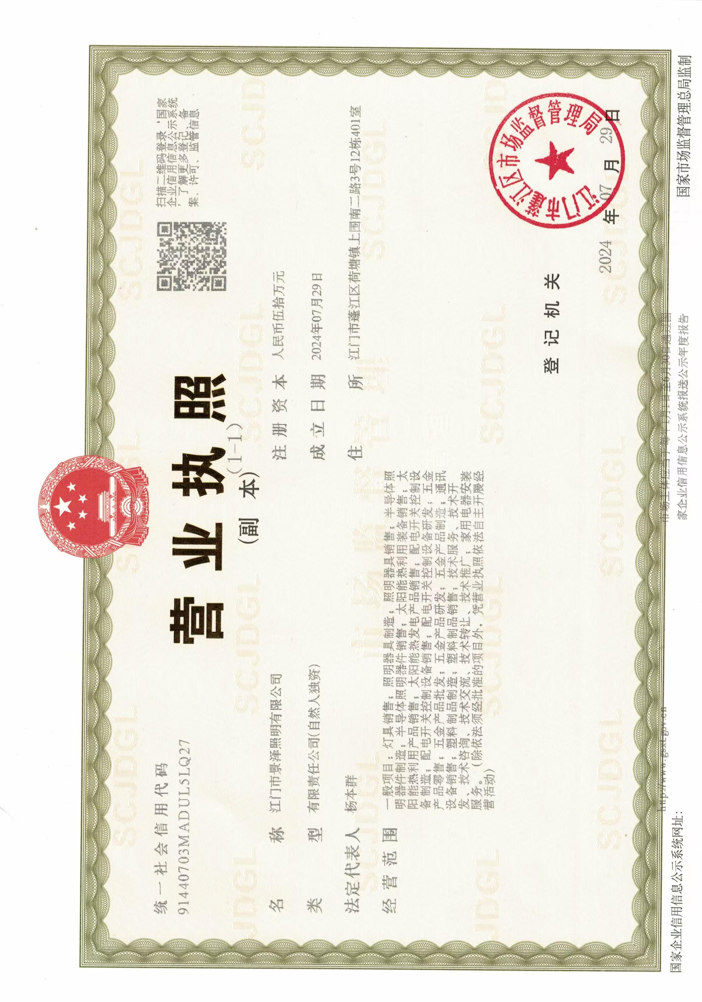 Founded in 2024 in Jiangmen City, Guangdong Province, Jiangmen Jingze Lighting Co., Ltd. is a manufacturer and seller of lighting fixtures, semiconductor lighting devices, solar thermal utilization equipments, power distribution switching and control equipments, and hardware products. The main products are outdoor lighting fixtures, LED line lights, LED wall washer lights, LED flood lights, LED buried lights. The products are favored by customers all over the country, and the products are exported to home and abroad.